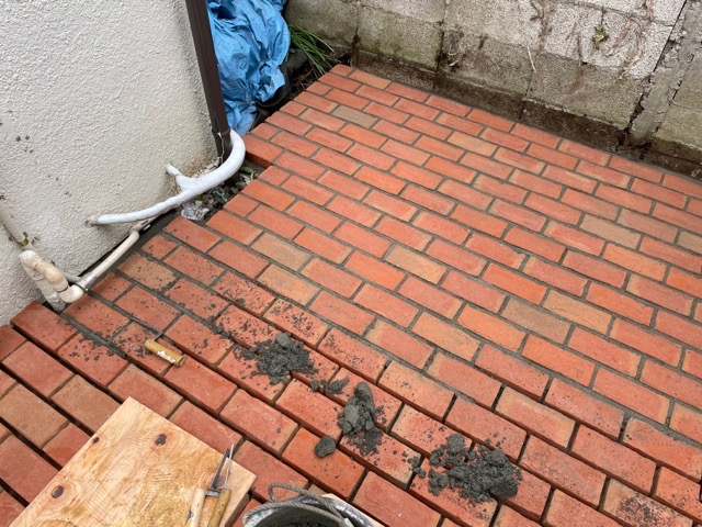 並べただけのレンガだとすぐ動いてしまうので目地にモルタルをしっかり詰め込み動かないようにします。目地が入る事でがっちりと一体化し強度が出ます。