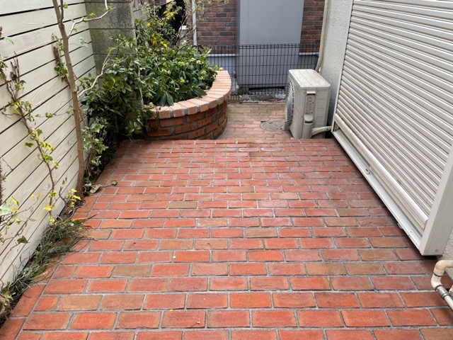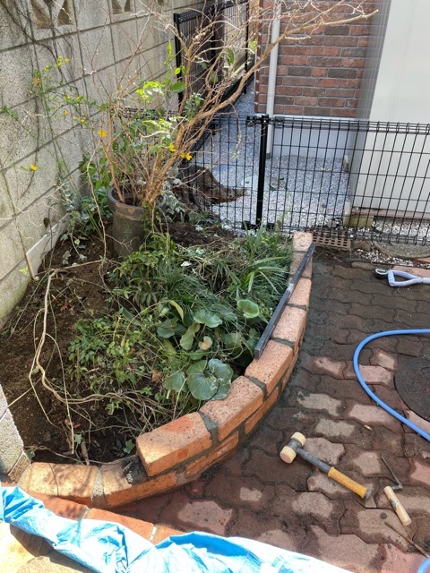 このように素敵なレンガテラスの完成。現地調査時の草だらけの空間から使いやすくくつろげる場所が出来ました。続いて花壇を作ります。