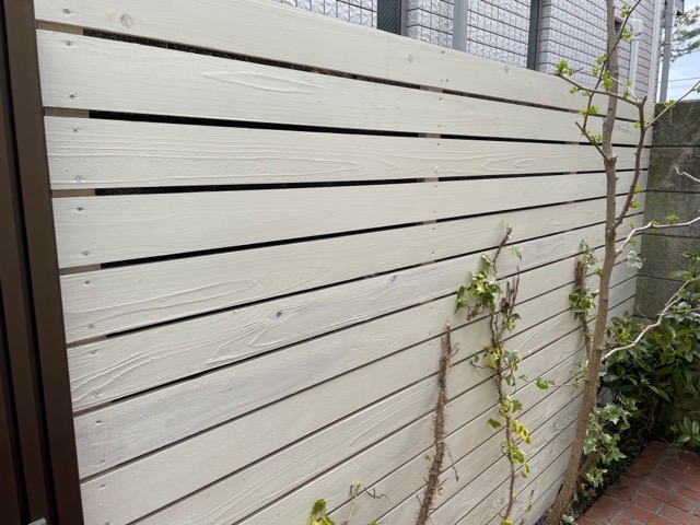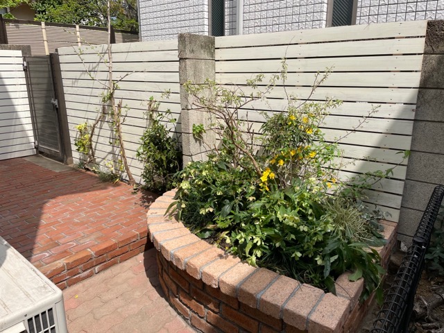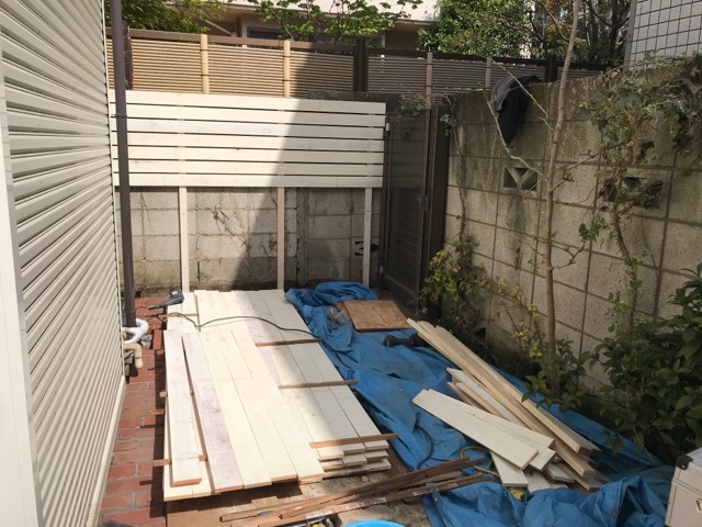 せっかくのレンガテラスの足を引っ張るブロック塀をウッドフェンスで覆います。この部分は私がユーチューブを撮影するためにお客様に材料費だけ持ってもらい作りました。