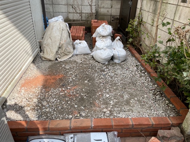 砕石を敷き詰めしっかりと転圧してはじめてレンガ敷のできる盤が完成します。地盤が甘いと長期的に見ればレンガの沈下やひび割れが発生し水が溜まってしまったりするので手を抜かず施工します。