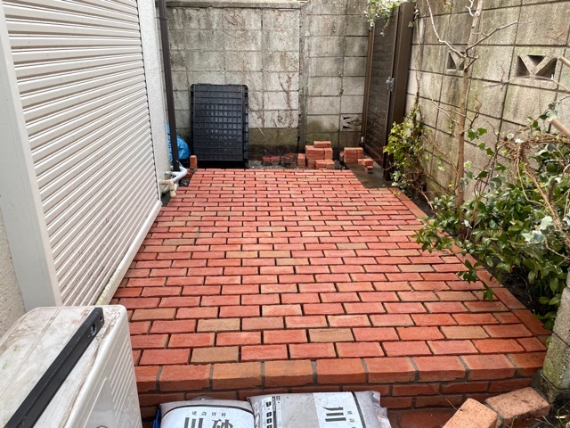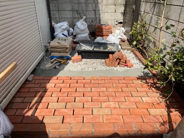 ここまで来ましたあとはレンガを敷くだけ並びを崩さないように集中してならべます。