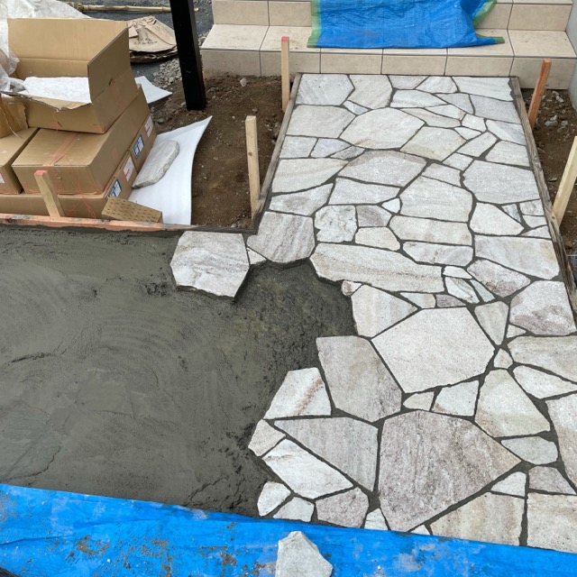 今回の石貼りは車が乗る可能性が大きいのでしっかりとした下地を作りました。下地がキチンと出来ていれば駐車場に乱形石貼りをする事もできます。