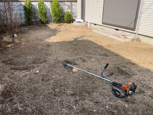 肩掛けでざっと背の高い草を刈ったら位置出しを行い下地を作ります。