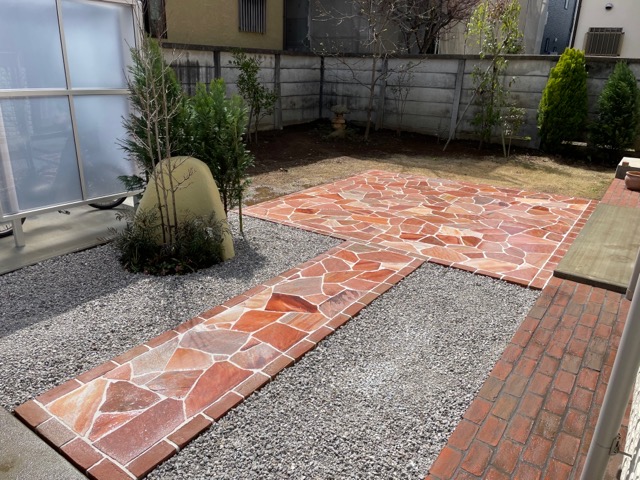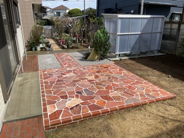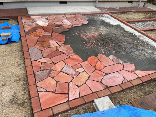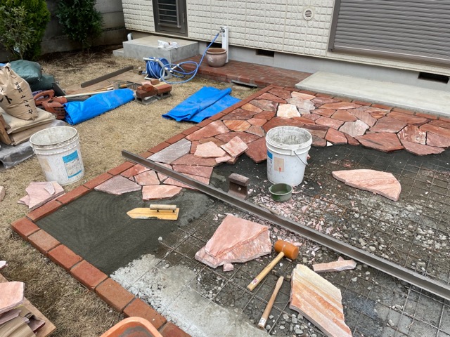 テラス部分は今回は赤系の乱形石貼りで犬走りのレンガに合わせて縁取りをつけて行きます。