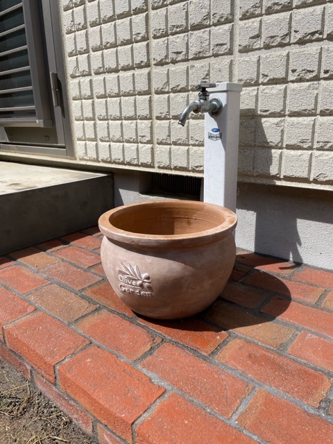 水栓にはよく見るプラ製の水受けだったので気に入った鉢を買ってきてもらって鉢底に穴を開けて目皿を入れおしゃれな水受けを作りました。