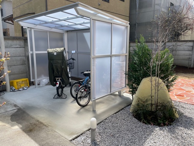 使い勝手の良いサイクルポートも出来上がりました。サイドパネル付きのサイクルポートなので吹き込む雨風の心配も無くなりますね