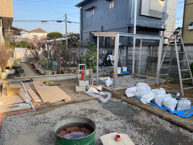 自転車が3−4台収まるサイクルポートも同時進行で進めていきます。家屋までの動線上に作る方が使い勝手が良いという事でこの位置に決まりました。