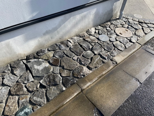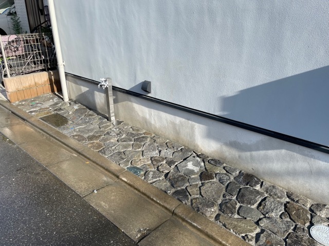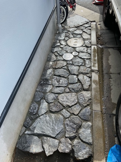 ①建物の正面(建物の印象を決める部分)の芝が伸びるので既存の土間を撤去して自然石を敷きたい②水道が使いにくいので前面に移設したい