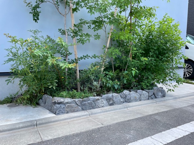花壇もまた石を使うことで自然の雰囲気を感じる仕上がりになります。奥様が石や植物など自然のものがお好きで自然材料で庭を作るご希望が今回叶えられたかと思います。