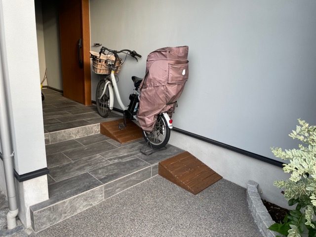 電動自転車を止める際に不便とおっしゃっていた段差も木材でスロープを作って設置しました。
