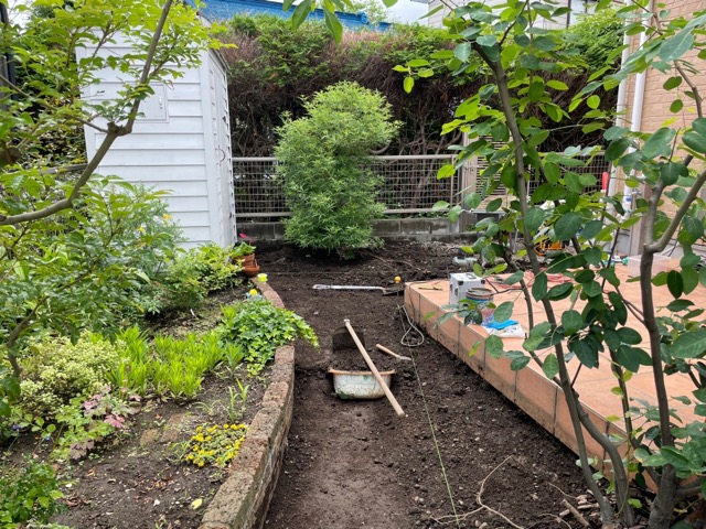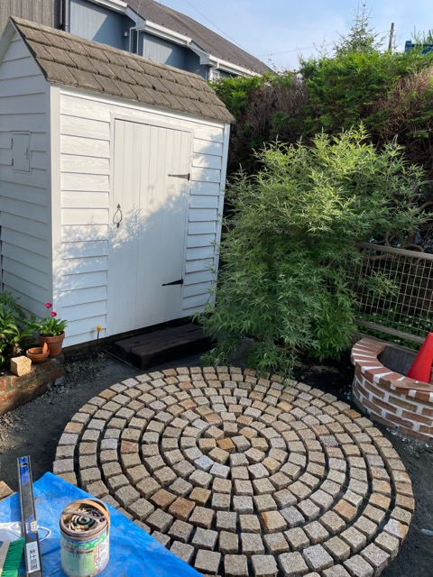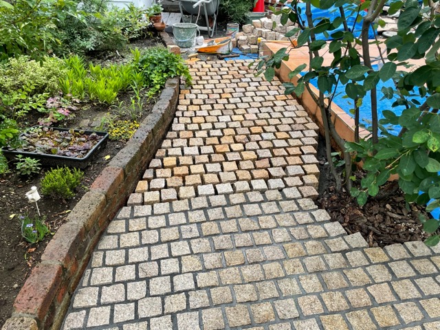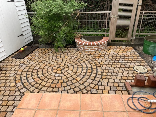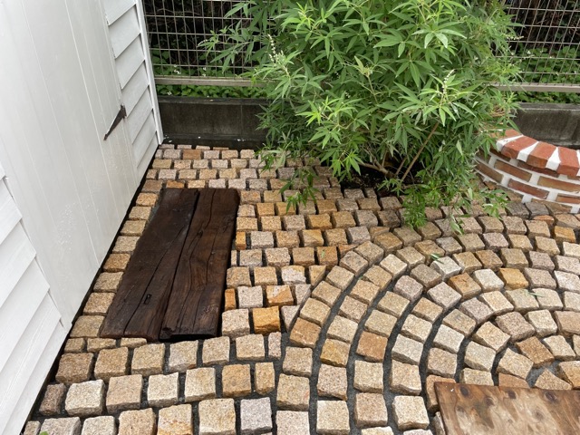 ピンコロ敷きの水勾配もうまく行って本当に良かった。今回も素敵なお庭になりました。