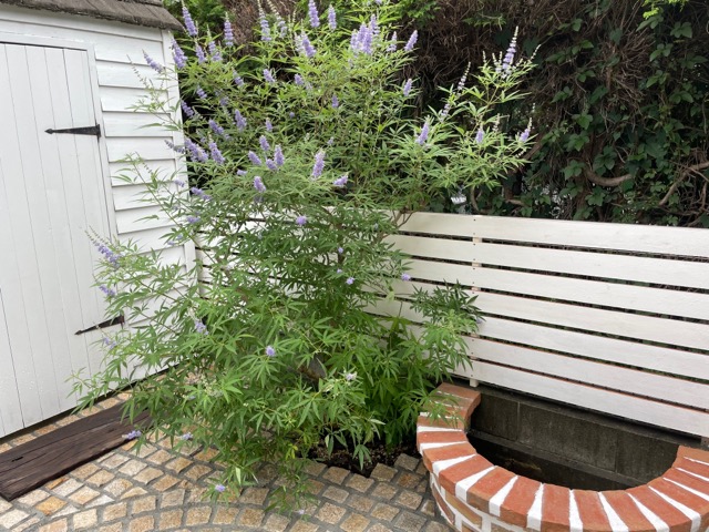 7年経過したとは思えないきれいな小屋は私が作りました。市販の物置ではこんな可愛い印象はないですよ! 足元は目地が入って完成です。