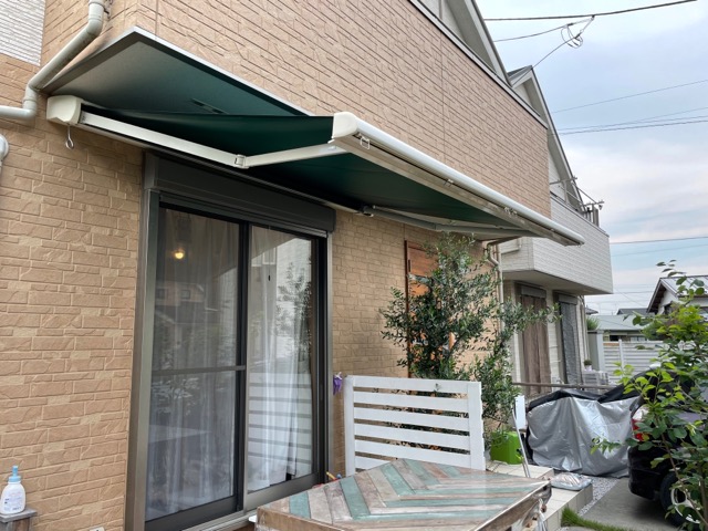 オーニングにはリクシルの彩風CR手動式を採用しました。熱線吸収キャンパスと前面スクリーンが効果的で熱や光の反射を防いでくれます。