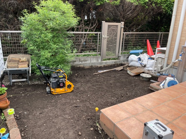 7年ほど前にお庭を作らせて頂いたお客様で今回は砂利敷きだったお庭部分を石かレンガで固めたいというご希望とタイルテラスの上にオーニングを付けたいというご注文です。