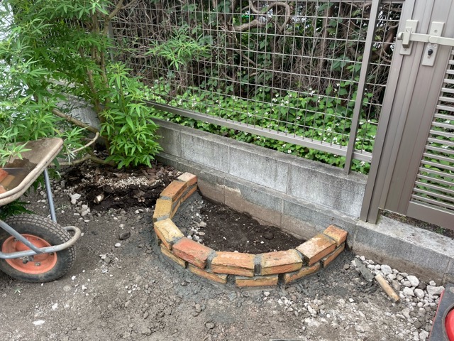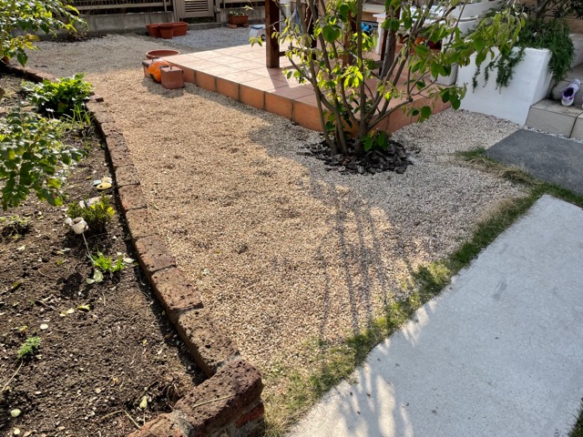 砂利の見切りに使っていたレンガも綺麗に洗って再利用。繰り返し使えるのがレンガのいい所ですね