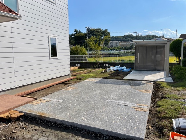 ■ 施工内容 タクボ物置大・リクシルネスカFサイクルポート・金鏝仕上げ土間10平米・洗い出し土間20平米
